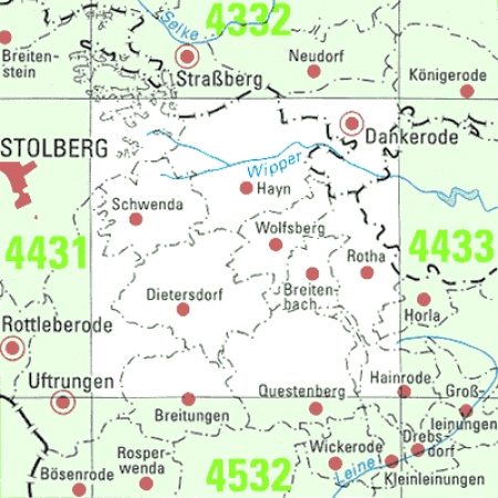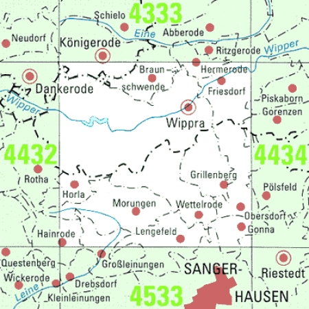 Maßstab 1:25 000, Nomenklatur: 4433, Name des Kartenblatts: Wippra, Auflagejahr: 2024, Blattschnitt: Normalblattschnitt (Preußische Landesaufnahme), Gradabteilungskarte mit 10 min geographischer Länge und 6 min geographischer Breite, Geodätischer Raumbezug: GRS80-Ellipsoid, ...