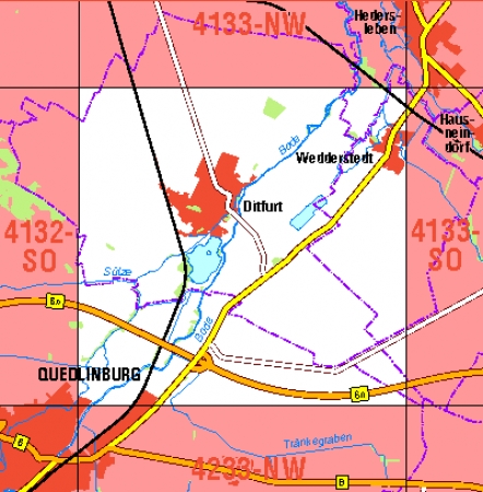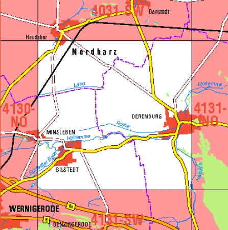 Maßstab 1:10 000, Nomenklatur: 4131-NW, Name des Kartenblatts: Derenburg, Auflagejahr: 2022, Blattschnitt: Normalblattschnitt (Preußische Landesaufnahme), Gradabteilungskarte mit 5 min geographischer Länge und 3 min geographischer Breite, Geodätischer Raumbezug: GRS80-Ellipsoid, ...