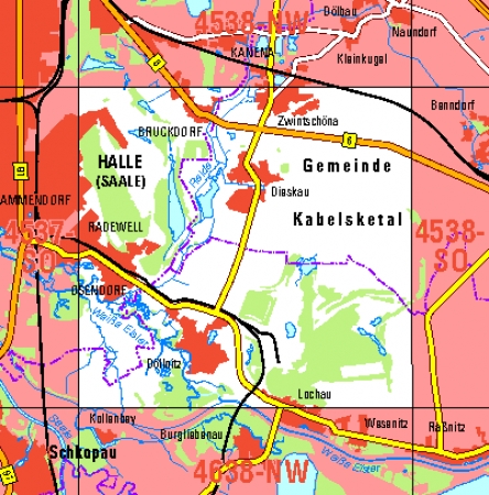 Maßstab 1:10 000, Nomenklatur: 4538-SW, Name des Kartenblatts: Dieskau, Auflagejahr: 2023, Blattschnitt: Normalblattschnitt (Preußische Landesaufnahme), Gradabteilungskarte mit 5 min geographischer Länge und 3 min geographischer Breite, Geodätischer Raumbezug: GRS80-Ellipsoid, ...