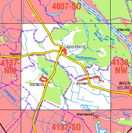 Maßstab 1:10 000, Nomenklatur: 4137-NO, Name des Kartenblatts: Diebzig, Auflagejahr: 2021, Blattschnitt: Normalblattschnitt (Preußische Landesaufnahme), Gradabteilungskarte mit 5 min geographischer Länge und 3 min geographischer Breite, Geodätischer Raumbezug: GRS80-Ellipsoid, ...