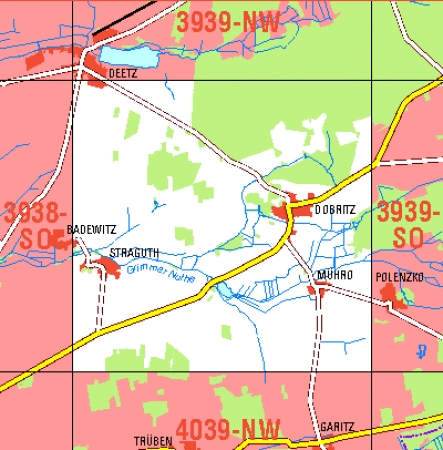 Maßstab 1:10 000, Nomenklatur: 3939-SW, Name des Kartenblatts: Dobritz, Auflagejahr: 2021, Blattschnitt: Normalblattschnitt (Preußische Landesaufnahme), Gradabteilungskarte mit 5 min geographischer Länge und 3 min geographischer Breite, Geodätischer Raumbezug: GRS80-Ellipsoid, ...