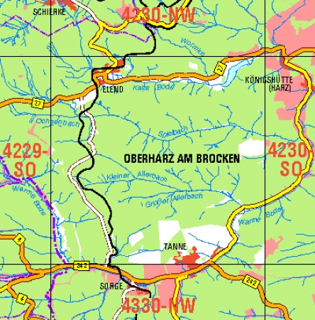 Maßstab 1:10 000, Nomenklatur: 4230-SW, Name des Kartenblatts: Elend, Auflagejahr: 2022, Der Anteil Sachsen-Anhalt (ST) kann bis zur Landesgrenze Niedersachsen (NI) bereitgestellt werden. Das Gebiet zu NI wird als weiße Fläche dargestellt. Blattschnitt: Normalblattschnitt (Preußische ...