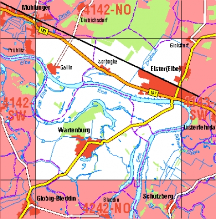 Maßstab 1:10 000, Nomenklatur: 4142-SO, Name des Kartenblatts: Elster (Elbe), Auflagejahr: 2024, Blattschnitt: Normalblattschnitt (Preußische Landesaufnahme), Gradabteilungskarte mit 5 min geographischer Länge und 3 min geographischer Breite, Geodätischer Raumbezug: GRS80-Ellipsoid, ...