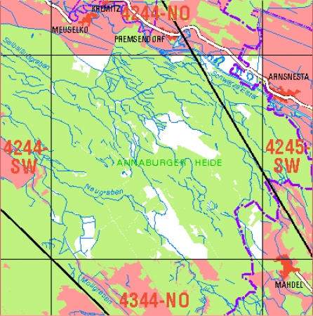 Maßstab 1:10 000, Nomenklatur: 4244-SO, Name des Kartenblatts: Annaburger Heide NO, Auflagejahr: 2022, Blattschnitt: Normalblattschnitt (Preußische Landesaufnahme), Gradabteilungskarte mit 5 min geographischer Länge und 3 min geographischer Breite, Geodätischer Raumbezug: ...