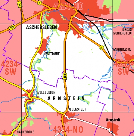 Maßstab 1:10 000, Nomenklatur: 4234-NO, Name des Kartenblatts: Aschersleben N, Auflagejahr: 2023, Blattschnitt: Normalblattschnitt (Preußische Landesaufnahme), Gradabteilungskarte mit 5 min geographischer Länge und 3 min geographischer Breite, Geodätischer Raumbezug: GRS80-Ellipsoid, ...