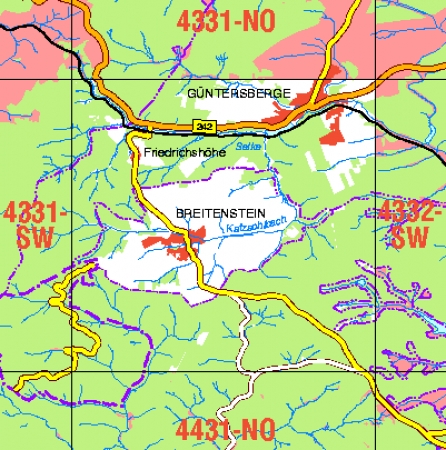 Maßstab 1:10 000, Nomenklatur: 4331-SO, Name des Kartenblatts: Güntersberge, Auflagejahr: 2022, Blattschnitt: Normalblattschnitt (Preußische Landesaufnahme), Gradabteilungskarte mit 5 min geographischer Länge und 3 min geographischer Breite, Geodätischer Raumbezug: ...