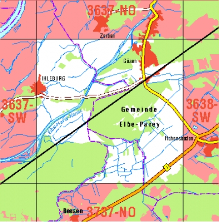 Maßstab 1:10 000, Nomenklatur: 3637-SO, Name des Kartenblatts: Güsen, Auflagejahr: 2024, Blattschnitt: Normalblattschnitt (Preußische Landesaufnahme), Gradabteilungskarte mit 5 min geographischer Länge und 3 min geographischer Breite, Geodätischer Raumbezug: GRS80-Ellipsoid, ...
