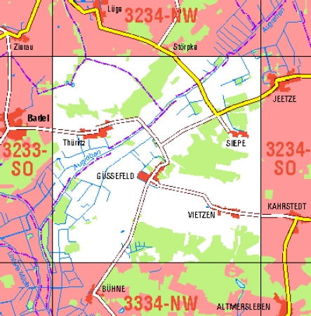 Maßstab 1:10 000, Nomenklatur: 3234-SW, Name des Kartenblatts: Güssefeld, Auflagejahr: 2021, Blattschnitt: Normalblattschnitt (Preußische Landesaufnahme), Gradabteilungskarte mit 5 min geographischer Länge und 3 min geographischer Breite, Geodätischer Raumbezug: GRS80-Ellipsoid, ...
