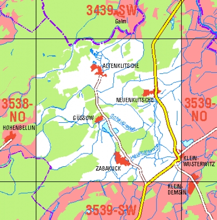 Maßstab 1:10 000, Nomenklatur: 3539-NW, Name des Kartenblatts: Güssow, Auflagejahr: 2021, Blattschnitt: Normalblattschnitt (Preußische Landesaufnahme), Gradabteilungskarte mit 5 min geographischer Länge und 3 min geographischer Breite, Geodätischer Raumbezug: GRS80-Ellipsoid, ...