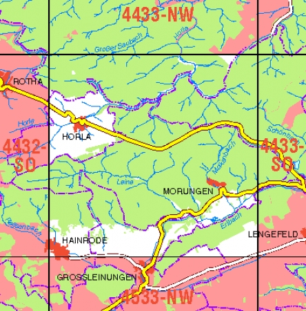 Maßstab 1:10 000, Nomenklatur: 4433-SW, Name des Kartenblatts: Hainrode, Auflagejahr: 2023, Blattschnitt: Normalblattschnitt (Preußische Landesaufnahme), Gradabteilungskarte mit 5 min geographischer Länge und 3 min geographischer Breite, Geodätischer Raumbezug: GRS80-Ellipsoid, ...