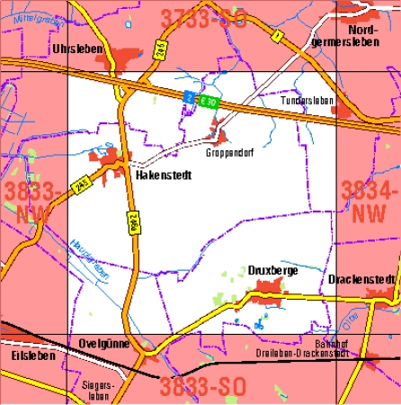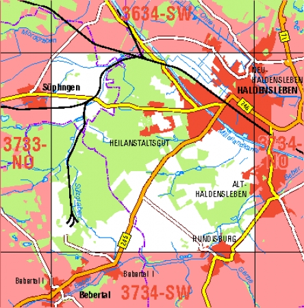 Maßstab 1:10 000, Nomenklatur: 3734-NW, Name des Kartenblatts: Haldensleben, Auflagejahr: 2024, Blattschnitt: Normalblattschnitt (Preußische Landesaufnahme), Gradabteilungskarte mit 5 min geographischer Länge und 3 min geographischer Breite, Geodätischer Raumbezug: GRS80-Ellipsoid, ...
