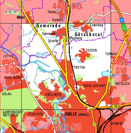 Maßstab 1:10 000, Nomenklatur: 4437-SW, Name des Kartenblatts: Halle (Saale)-Heide-Nord, Auflagejahr: 2023, Blattschnitt: Normalblattschnitt (Preußische Landesaufnahme), Gradabteilungskarte mit 5 min geographischer Länge und 3 min geographischer Breite, Geodätischer Raumbezug: ...