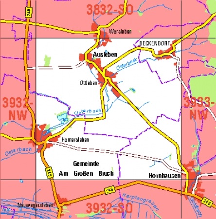 Maßstab 1:10 000, Nomenklatur: 3932-NO, Name des Kartenblatts: Ausleben, Auflagejahr: 2023, Blattschnitt: Normalblattschnitt (Preußische Landesaufnahme), Gradabteilungskarte mit 5 min geographischer Länge und 3 min geographischer Breite, Geodätischer Raumbezug: GRS80-Ellipsoid, ...