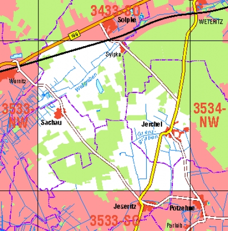 Maßstab 1:10 000, Nomenklatur: 3438-SW, Name des Kartenblatts: Jerichow, Auflagejahr: 2021, Blattschnitt: Normalblattschnitt (Preußische Landesaufnahme), Gradabteilungskarte mit 5 min geographischer Länge und 3 min geographischer Breite, Geodätischer Raumbezug: GRS80-Ellipsoid, ...