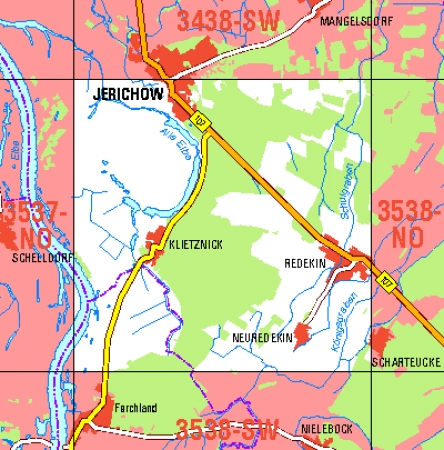 Maßstab 1:10 000, Nomenklatur: 3538-NW, Name des Kartenblatts: Jerichow-Klietznick, Auflagejahr: 2021, Blattschnitt: Normalblattschnitt (Preußische Landesaufnahme), Gradabteilungskarte mit 5 min geographischer Länge und 3 min geographischer Breite, Geodätischer Raumbezug: ...