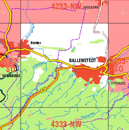 Maßstab 1:10 000, Nomenklatur: 4233-SW, Name des Kartenblatts: Ballenstedt, Auflagejahr: 2023, Blattschnitt: Normalblattschnitt (Preußische Landesaufnahme), Gradabteilungskarte mit 5 min geographischer Länge und 3 min geographischer Breite, Geodätischer Raumbezug: GRS80-Ellipsoid, ...