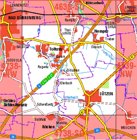 Maßstab 1:10 000, Nomenklatur: 4738-NO, Name des Kartenblatts: Lützen, Auflagejahr: 2022, Blattschnitt: Normalblattschnitt (Preußische Landesaufnahme), Gradabteilungskarte mit 5 min geographischer Länge und 3 min geographischer Breite, Geodätischer Raumbezug: GRS80-Ellipsoid, ...
