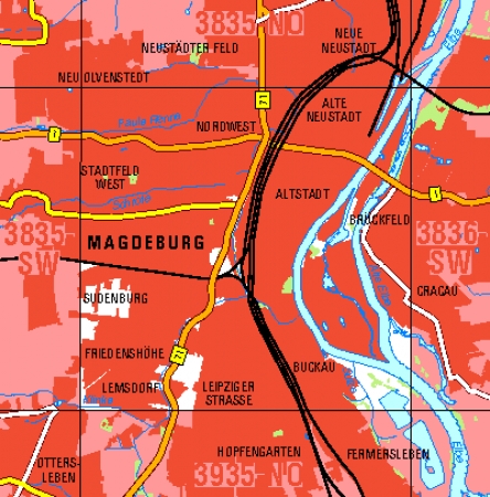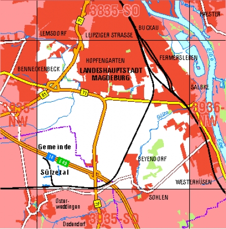Maßstab 1:10 000, Nomenklatur: 3835-SO, Name des Kartenblatts: Magdeburg, Auflagejahr: 2023, Blattschnitt: Normalblattschnitt (Preußische Landesaufnahme), Gradabteilungskarte mit 5 min geographischer Länge und 3 min geographischer Breite, Geodätischer Raumbezug: GRS80-Ellipsoid, ...