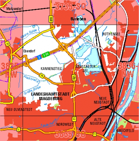 Maßstab 1:10 000, Nomenklatur: 3835-NO, Name des Kartenblatts: Magdeburg-Neustädter See, Auflagejahr: 2023, Blattschnitt: Normalblattschnitt (Preußische Landesaufnahme), Gradabteilungskarte mit 5 min geographischer Länge und 3 min geographischer Breite, Geodätischer ...