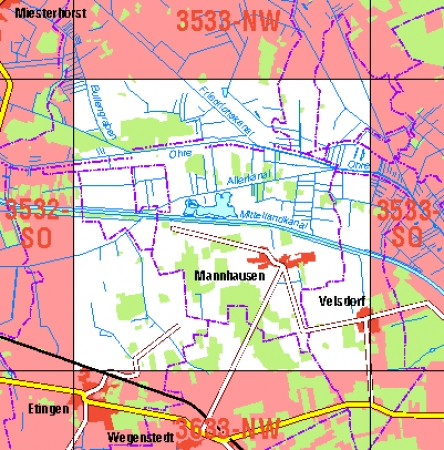Maßstab 1:10 000, Nomenklatur: 3533-SW, Name des Kartenblatts: Mannhausen, Auflagejahr: 2025, Blattschnitt: Normalblattschnitt (Preußische Landesaufnahme), Gradabteilungskarte mit 5 min geographischer Länge und 3 min geographischer Breite, Geodätischer Raumbezug: GRS80-Ellipsoid, ...