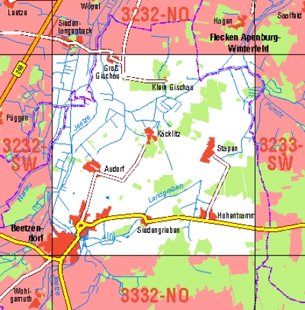 Maßstab 1:10 000, Nomenklatur: 3232-SO, Name des Kartenblatts: Beetzendorf, Auflagejahr: 2020, Blattschnitt: Normalblattschnitt (Preußische Landesaufnahme), Gradabteilungskarte mit 5 min geographischer Länge und 3 min geographischer Breite, Geodätischer Raumbezug: GRS80-Ellipsoid, ...