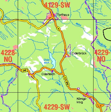 Maßstab 1:10 000, Nomenklatur: 4229-NW, Name des Kartenblatts: Oderteich, Auflagejahr: 2022, Der Anteil Sachsen-Anhalt (ST) kann bis zur Landesgrenze Niedersachsen (NI) bereitgestellt werden. Das Gebiet zu NI wird als weiße Fläche dargestellt. Blattschnitt: Normalblattschnitt ...