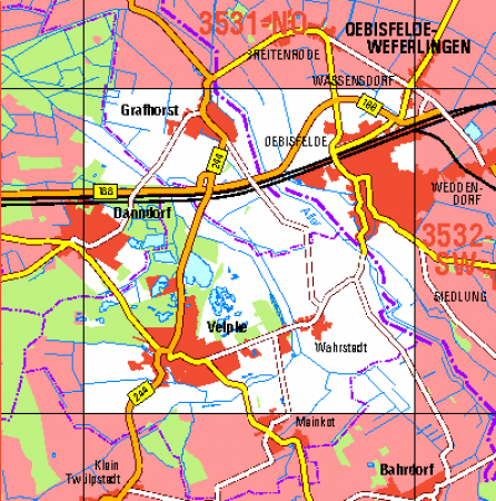 Maßstab 1:10 000, Nomenklatur: 3531-SO, Name des Kartenblatts: Oebisfelde, Auflagejahr: 2021, Der Anteil Sachsen-Anhalt (ST) kann bis zur Landesgrenze Niedersachsen (NI) bereitgestellt werden. Das Gebiet zu NI wird als weiße Fläche dargestellt. Blattschnitt: Normalblattschnitt ...