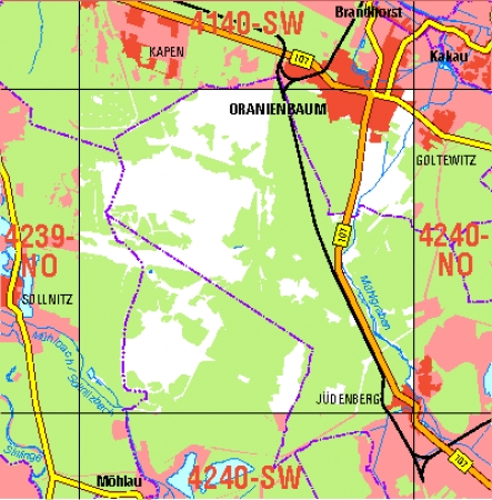 Maßstab 1:10 000, Nomenklatur: 4240-NW, Name des Kartenblatts: Oranienbaum S, Auflagejahr: 2020, Blattschnitt: Normalblattschnitt (Preußische Landesaufnahme), Gradabteilungskarte mit 5 min geographischer Länge und 3 min geographischer Breite, Geodätischer Raumbezug: GRS80-Ellipsoid, ...
