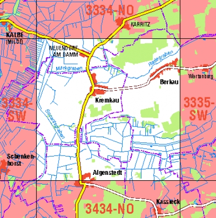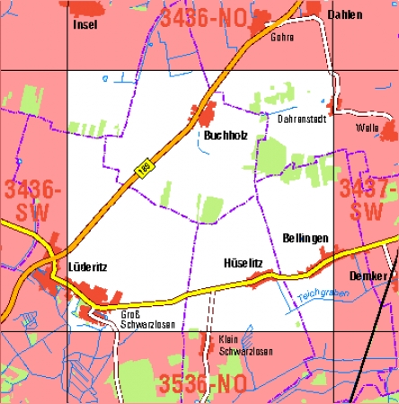 Maßstab 1:10 000, Nomenklatur: 3131-NO, Name des Kartenblatts: Bergen (Dumme), Auflagejahr: 2022, Der Anteil Sachsen-Anhalt (ST) kann bis zur Landesgrenze Niedersachsen (NI) bereitgestellt werden. Das Gebiet zu NI wird als weiße Fläche dargestellt. Blattschnitt: Normalblattschnitt ...