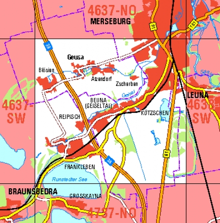 Maßstab 1:10 000, Nomenklatur: 4637-SO, Name des Kartenblatts: Beuna (Geiseltal), Auflagejahr: 2023, Blattschnitt: Normalblattschnitt (Preußische Landesaufnahme), Gradabteilungskarte mit 5 min geographischer Länge und 3 min geographischer Breite, Geodätischer Raumbezug: ...