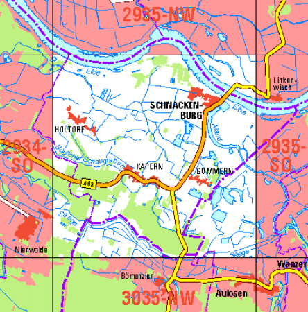 Maßstab 1:10 000, Nomenklatur: 2935-SW, Name des Kartenblatts: Schnackenburg, Auflagejahr: 2021, Der Anteil Sachsen-Anhalt (ST) kann bis zur Landesgrenze Niedersachsen (NI) bereitgestellt werden. Das Gebiet zu NI wird als weiße Fläche dargestellt. Blattschnitt: Normalblattschnitt ...