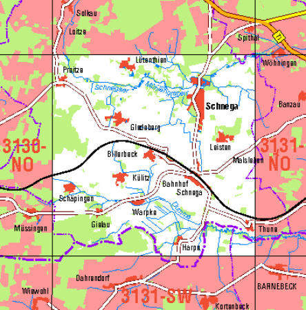 Maßstab 1:10 000, Nomenklatur: 3131-NW, Name des Kartenblatts: Schnega, Auflagejahr: 2022, Der Anteil Sachsen-Anhalt (ST) kann bis zur Landesgrenze Niedersachsen (NI) bereitgestellt werden. Das Gebiet zu NI wird als weiße Fläche dargestellt. Blattschnitt: Normalblattschnitt (Preußische ...