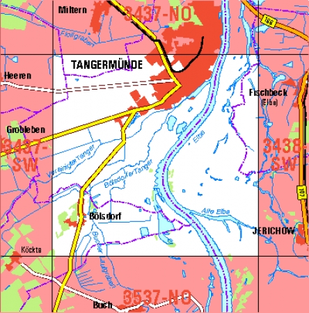 Maßstab 1:10 000, Nomenklatur: 3437-SO, Name des Kartenblatts: Tangermünde, Auflagejahr: 2021, Blattschnitt: Normalblattschnitt (Preußische Landesaufnahme), Gradabteilungskarte mit 5 min geographischer Länge und 3 min geographischer Breite, Geodätischer Raumbezug: GRS80-Ellipsoid, ...