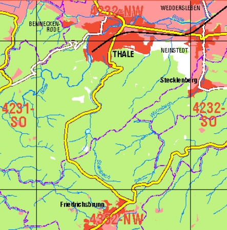 Maßstab 1:10 000, Nomenklatur: 4232-SW, Name des Kartenblatts: Thale S, Auflagejahr: 2023, Blattschnitt: Normalblattschnitt (Preußische Landesaufnahme), Gradabteilungskarte mit 5 min geographischer Länge und 3 min geographischer Breite, Geodätischer Raumbezug: GRS80-Ellipsoid, ...