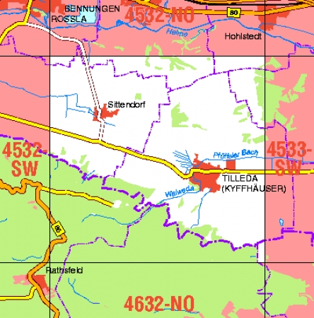 Maßstab 1:10 000, Nomenklatur: 4532-SO, Name des Kartenblatts: Tilleda, Auflagejahr: 2021, Blattschnitt: Normalblattschnitt (Preußische Landesaufnahme), Gradabteilungskarte mit 5 min geographischer Länge und 3 min geographischer Breite, Geodätischer Raumbezug: GRS80-Ellipsoid, ...