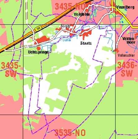 Maßstab 1:10 000, Nomenklatur: 3435-SO, Name des Kartenblatts: Uchtspringe, Auflagejahr: 2020, Blattschnitt: Normalblattschnitt (Preußische Landesaufnahme), Gradabteilungskarte mit 5 min geographischer Länge und 3 min geographischer Breite, Geodätischer Raumbezug: GRS80-Ellipsoid, ...