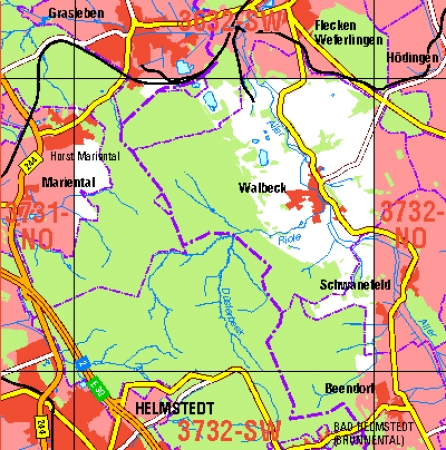 Maßstab 1:10 000, Nomenklatur: 3732-NW, Name des Kartenblatts: Walbeck, Auflagejahr: 2021, Der Anteil Sachsen-Anhalt (ST) kann bis zur Landesgrenze Niedersachsen (NI) bereitgestellt werden. Das Gebiet zu NI wird als weiße Fläche dargestellt. Blattschnitt: Normalblattschnitt (Preußische ...