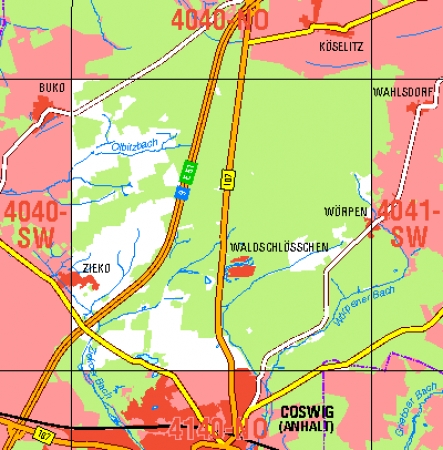 Maßstab 1:10 000, Nomenklatur: 4040-SO, Name des Kartenblatts: Waldschlößchen, Auflagejahr: 2021, Blattschnitt: Normalblattschnitt (Preußische Landesaufnahme), Gradabteilungskarte mit 5 min geographischer Länge und 3 min geographischer Breite, Geodätischer Raumbezug: ...