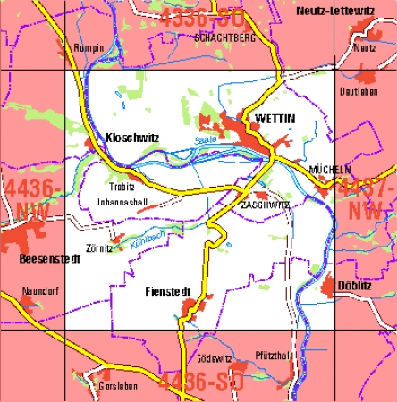 Maßstab 1:10 000, Nomenklatur: 4436-NO, Name des Kartenblatts: Wettin, Auflagejahr: 2024, Blattschnitt: Normalblattschnitt (Preußische Landesaufnahme), Gradabteilungskarte mit 5 min geographischer Länge und 3 min geographischer Breite, Geodätischer Raumbezug: GRS80-Ellipsoid, ...