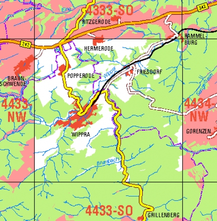 Maßstab 1:10 000, Nomenklatur: 4433-NO, Name des Kartenblatts: Wippra, Auflagejahr: 2021, Blattschnitt: Normalblattschnitt (Preußische Landesaufnahme), Gradabteilungskarte mit 5 min geographischer Länge und 3 min geographischer Breite, Geodätischer Raumbezug: GRS80-Ellipsoid, ...