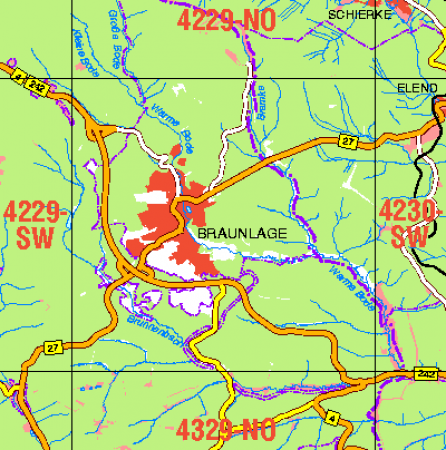 Maßstab 1:10 000, Nomenklatur: 4229-SO, Name des Kartenblatts: Braunlage, Auflagejahr: 2021, Der Anteil Sachsen-Anhalt (ST) kann bis zur Landesgrenze Niedersachsen (NI) bereitgestellt werden. Das Gebiet zu NI wird als weiße Fläche dargestellt. Blattschnitt: Normalblattschnitt ...