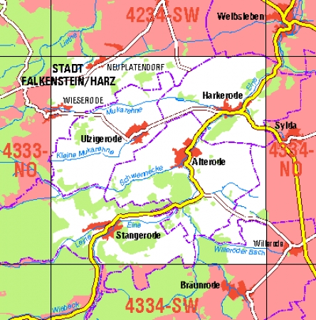 Maßstab 1:10 000, Nomenklatur: 4334-NW, Name des Kartenblatts: Alterode, Auflagejahr: 2021, Blattschnitt: Normalblattschnitt (Preußische Landesaufnahme), Gradabteilungskarte mit 5 min geographischer Länge und 3 min geographischer Breite, Geodätischer Raumbezug: GRS80-Ellipsoid, ...