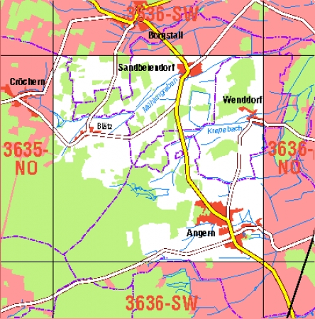 Maßstab 1:10 000, Nomenklatur: 3636-NW, Name des Kartenblatts: Angern, Auflagejahr: 2024, Blattschnitt: Normalblattschnitt (Preußische Landesaufnahme), Gradabteilungskarte mit 5 min geographischer Länge und 3 min geographischer Breite, Geodätischer Raumbezug: GRS80-Ellipsoid, ...