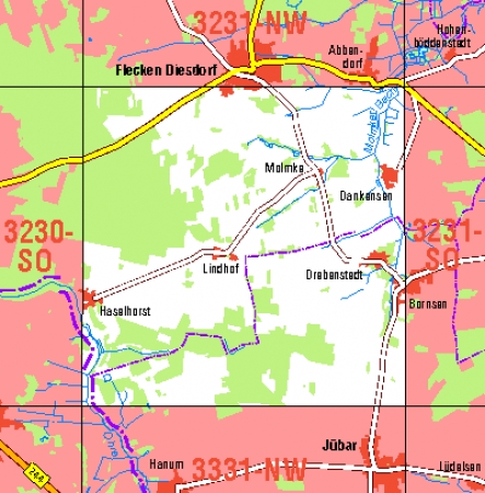Maßstab 1:10 000, Nomenklatur: 3231-SW, Name des Kartenblatts: Drebenstedt, Auflagejahr: 2022, Der Anteil Sachsen-Anhalt (ST) kann bis zur Landesgrenze Niedersachsen (NI) bereitgestellt werden. Das Gebiet zu NI wird als weiße Fläche dargestellt. Blattschnitt: Normalblattschnitt ...