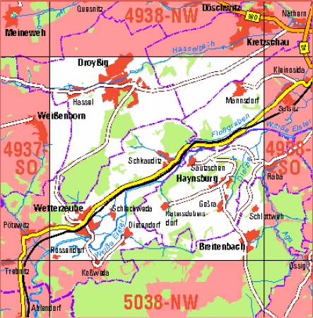 Maßstab 1:10 000, Nomenklatur: 4938-SW, Name des Kartenblatts: Droyßig, Auflagejahr: 2021, Blattschnitt: Normalblattschnitt (Preußische Landesaufnahme), Gradabteilungskarte mit 5 min geographischer Länge und 3 min geographischer Breite, Geodätischer Raumbezug: GRS80-Ellipsoid, ...