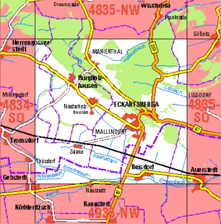 Maßstab 1:10 000, Nomenklatur: 4835-SW, Name des Kartenblatts: Eckartsberga, Auflagejahr: 2024, Blattschnitt: Normalblattschnitt (Preußische Landesaufnahme), Gradabteilungskarte mit 5 min geographischer Länge und 3 min geographischer Breite, Geodätischer Raumbezug: GRS80-Ellipsoid, ...