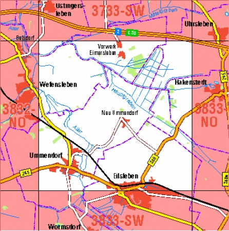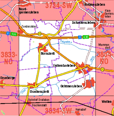 Maßstab 1:10 000, Nomenklatur: 3833-NW, Name des Kartenblatts: Eilsleben N, Auflagejahr: 2024, Blattschnitt: Normalblattschnitt (Preußische Landesaufnahme), Gradabteilungskarte mit 5 min geographischer Länge und 3 min geographischer Breite, Geodätischer Raumbezug: GRS80-Ellipsoid, ...