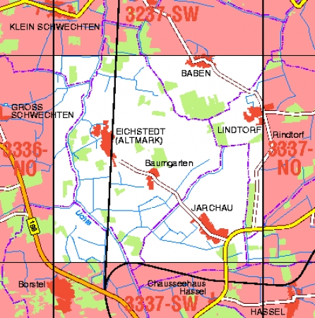 Maßstab 1:10 000, Nomenklatur: 3337-NW, Name des Kartenblatts: Eichstedt (Altmark), Auflagejahr: 2022, Blattschnitt: Normalblattschnitt (Preußische Landesaufnahme), Gradabteilungskarte mit 5 min geographischer Länge und 3 min geographischer Breite, Geodätischer Raumbezug: ...