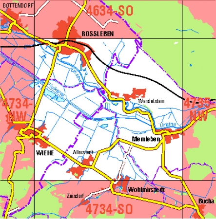 Maßstab 1:10 000, Nomenklatur: 4734-NO, Name des Kartenblatts: Memleben, Auflagejahr: 2023, Blattschnitt: Normalblattschnitt (Preußische Landesaufnahme), Gradabteilungskarte mit 5 min geographischer Länge und 3 min geographischer Breite, Geodätischer Raumbezug: GRS80-Ellipsoid, ...