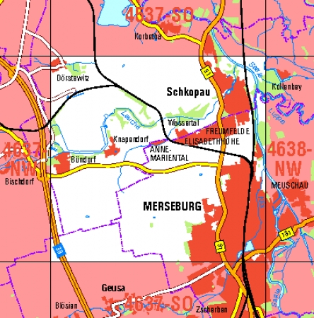 Maßstab 1:10 000, Nomenklatur: 4638-NW, Name des Kartenblatts: Merseburg-Meuschau, Auflagejahr: 2023, Blattschnitt: Normalblattschnitt (Preußische Landesaufnahme), Gradabteilungskarte mit 5 min geographischer Länge und 3 min geographischer Breite, Geodätischer Raumbezug: ...